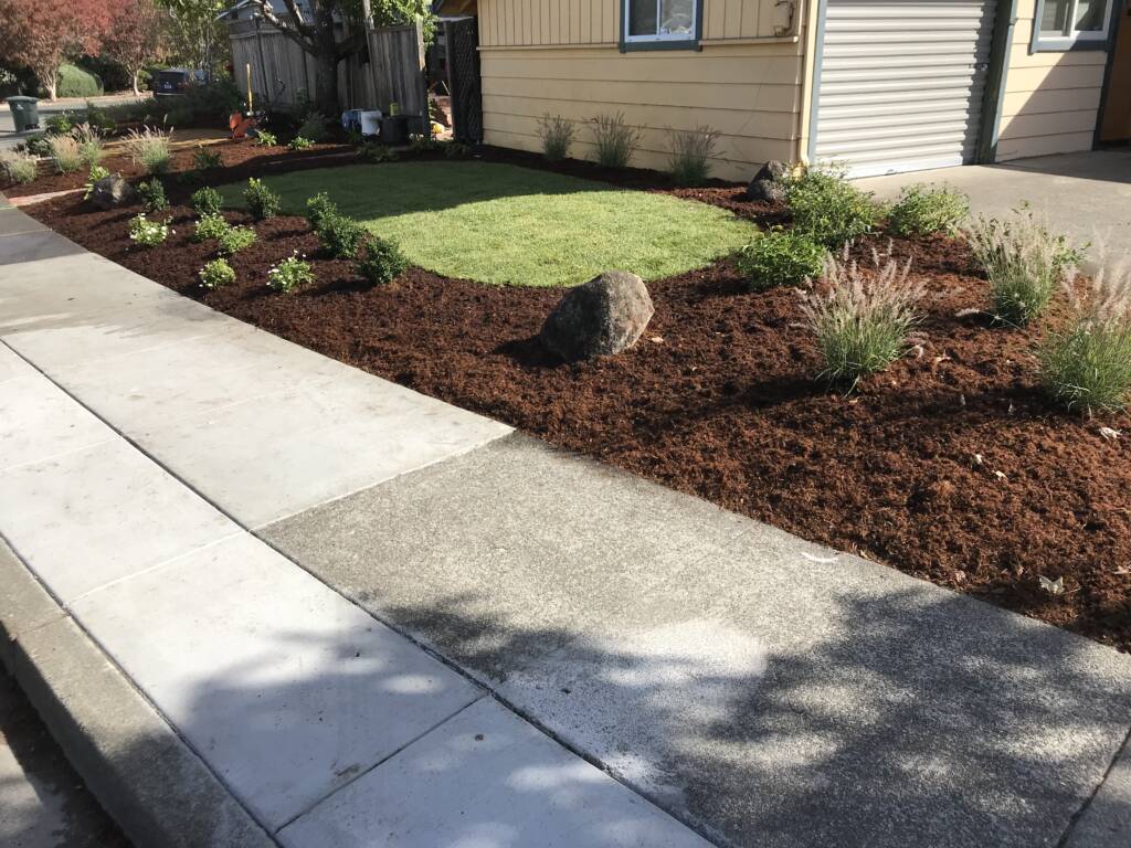 For this project, we installed fresh sod to create a vibrant, green lawn as the centerpiece. Around the perimeter, we planted a mix of hardy native grasses and bright lantanas for color and texture. A clean border of mulch ties the look together, helping with moisture retention and weed control while giving the space a neat, finished feel.
